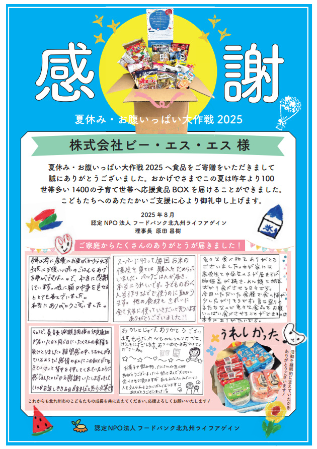当社は、認定NPO法人フードバンク北九州ライフアゲインの特別法人会員として、「すべての子どもたちが大切にされる社会」「誰も取り残さない助け合いの社会」を目指し、地域社会の支援活動に積極的に取り組んでいます。